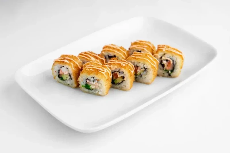 Жареный в темпуре роллс лососем, авокадо, икрой летучей рыбы, краб-кремом и сливочным сыром. Декорирован соусом "Лава"